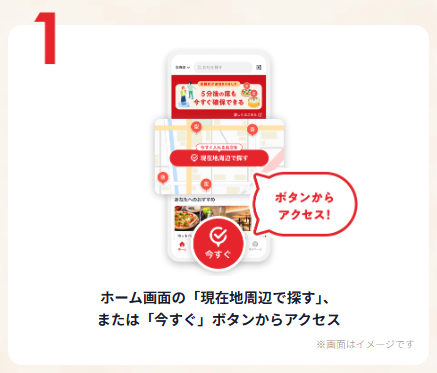 ステップ①:アプリホームの「現在地周辺で探す」をタップ。