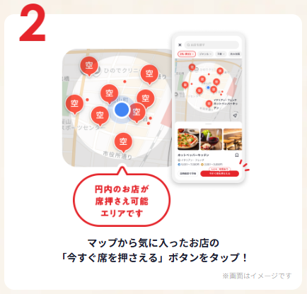 ステップ②:行きたいお店の「今すぐ席を押さえる」ボタンタップ。