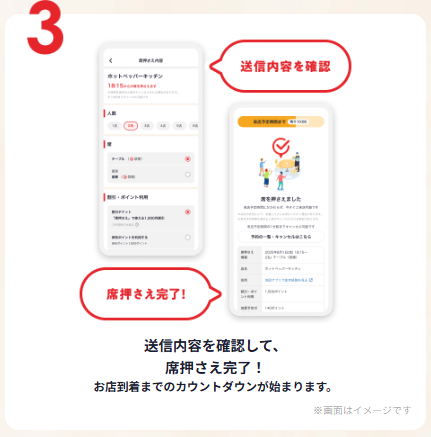 席押さえとは、マップ上で空席が見えて今まさに空いてるお店を見つけてすぐ入れる便利機能だよ~。