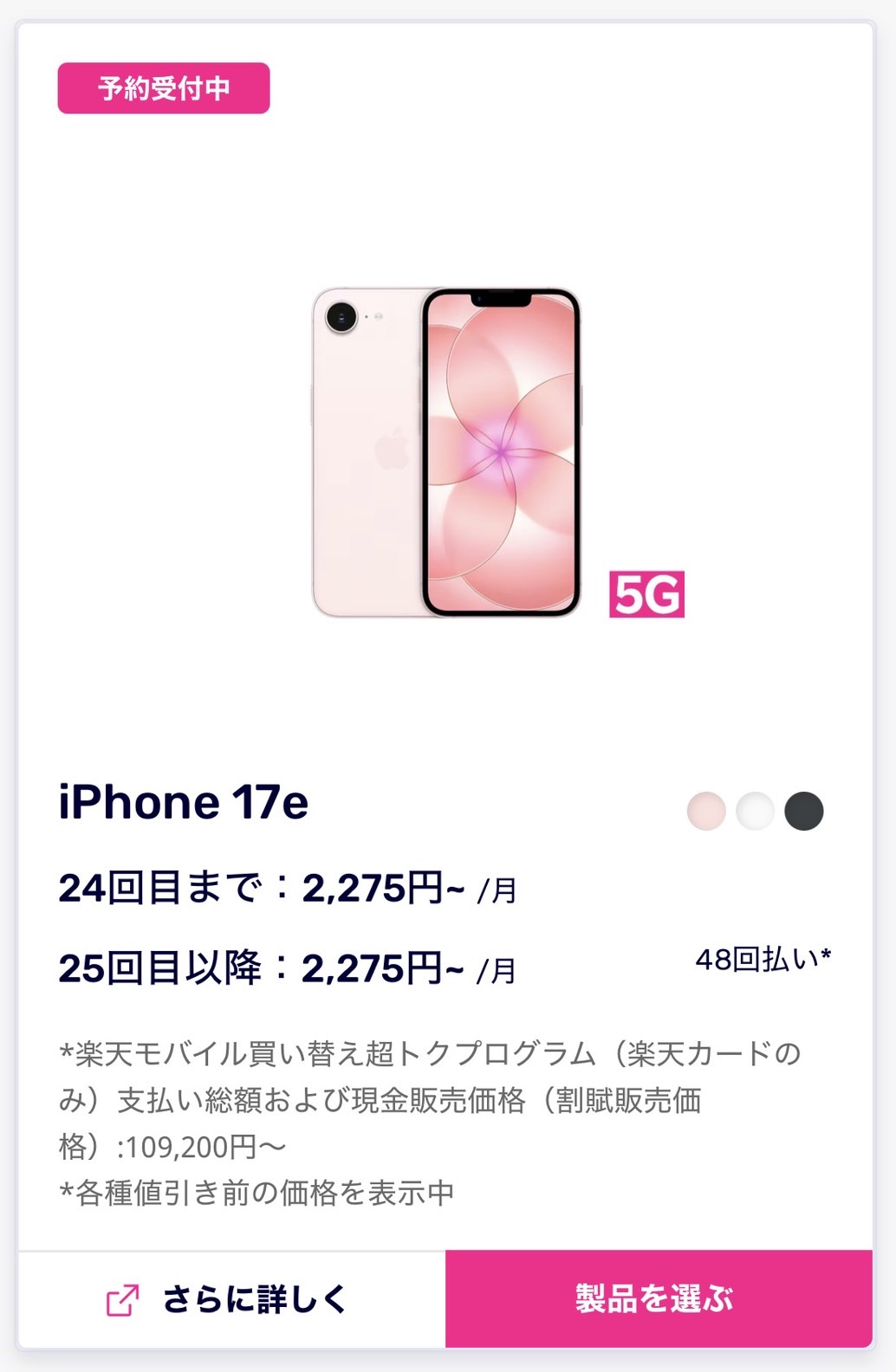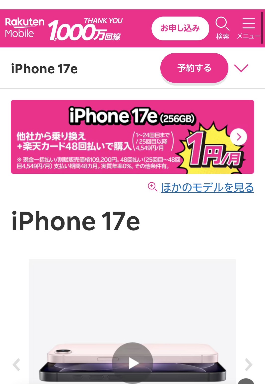 iPhone 17e のところで「製品を選ぶ」をタップ。