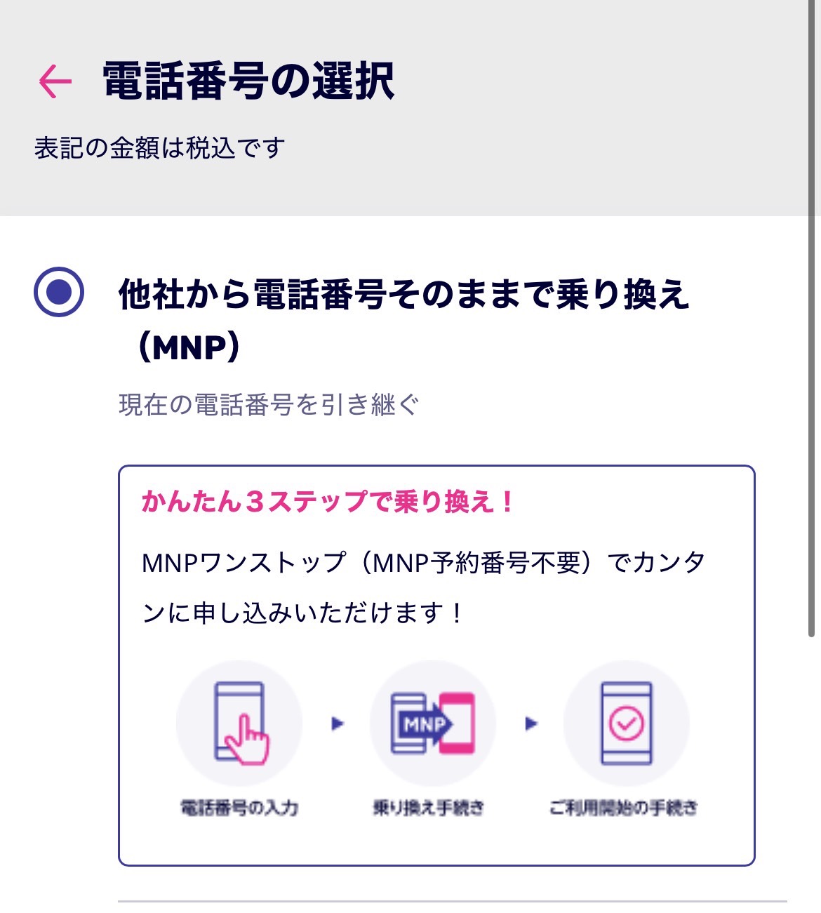 「他社から電話番号そのままで乗り換え (MNP)」を選んで、電話番号を入力する!