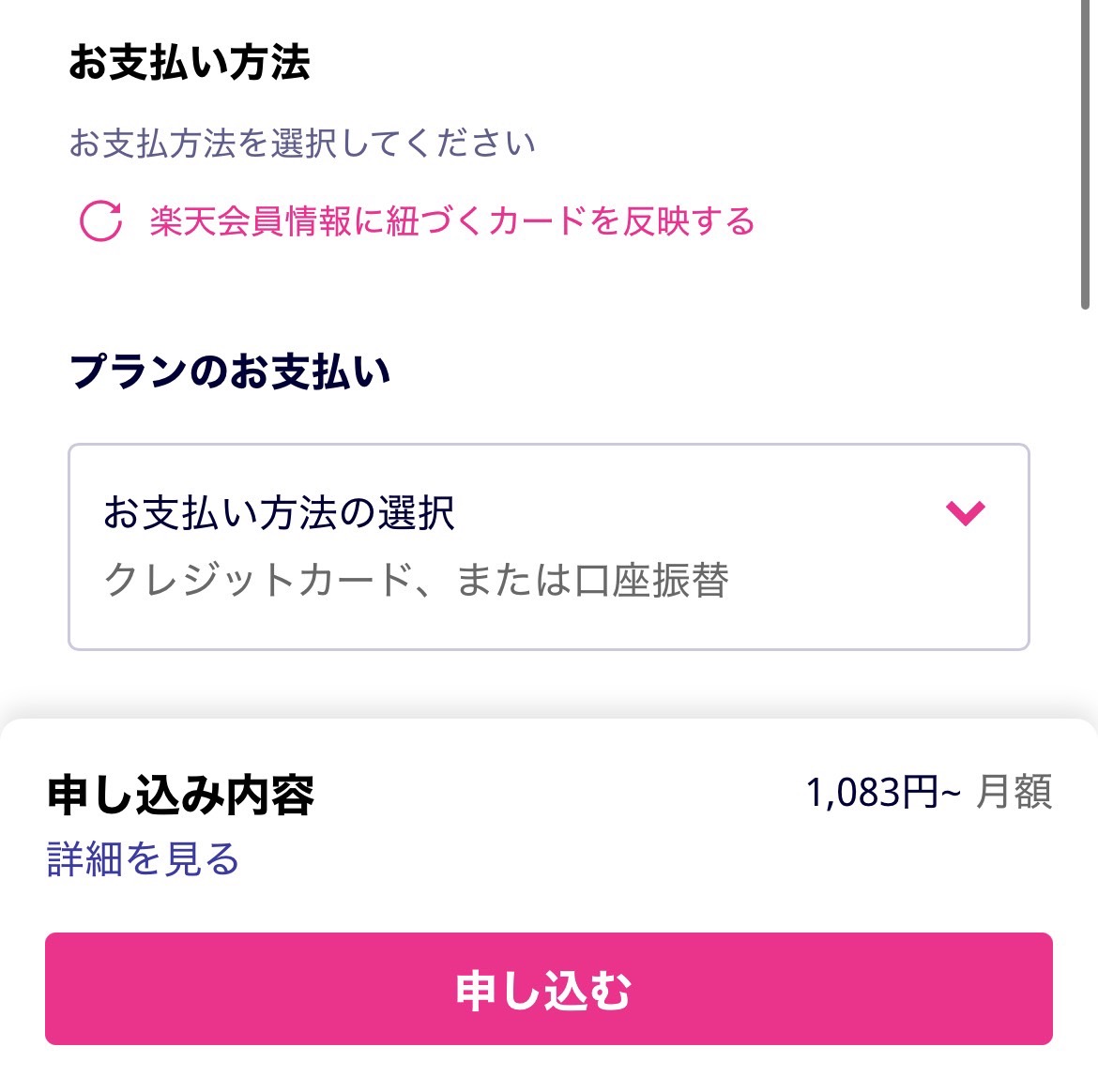 あとは支払方法を楽天カードにして「申し込む」をタップして、最後の画面で「24回目まで1円/月」となっていたらOK🙌😌