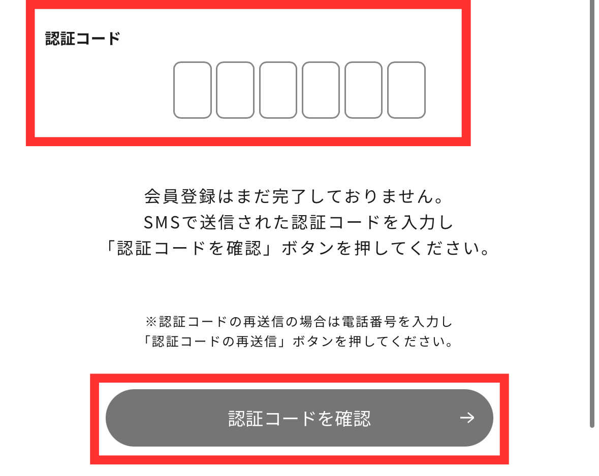 下の画面では電話番号宛てに届く6桁のコードを入力して、「認証コードを確認」をタップ!